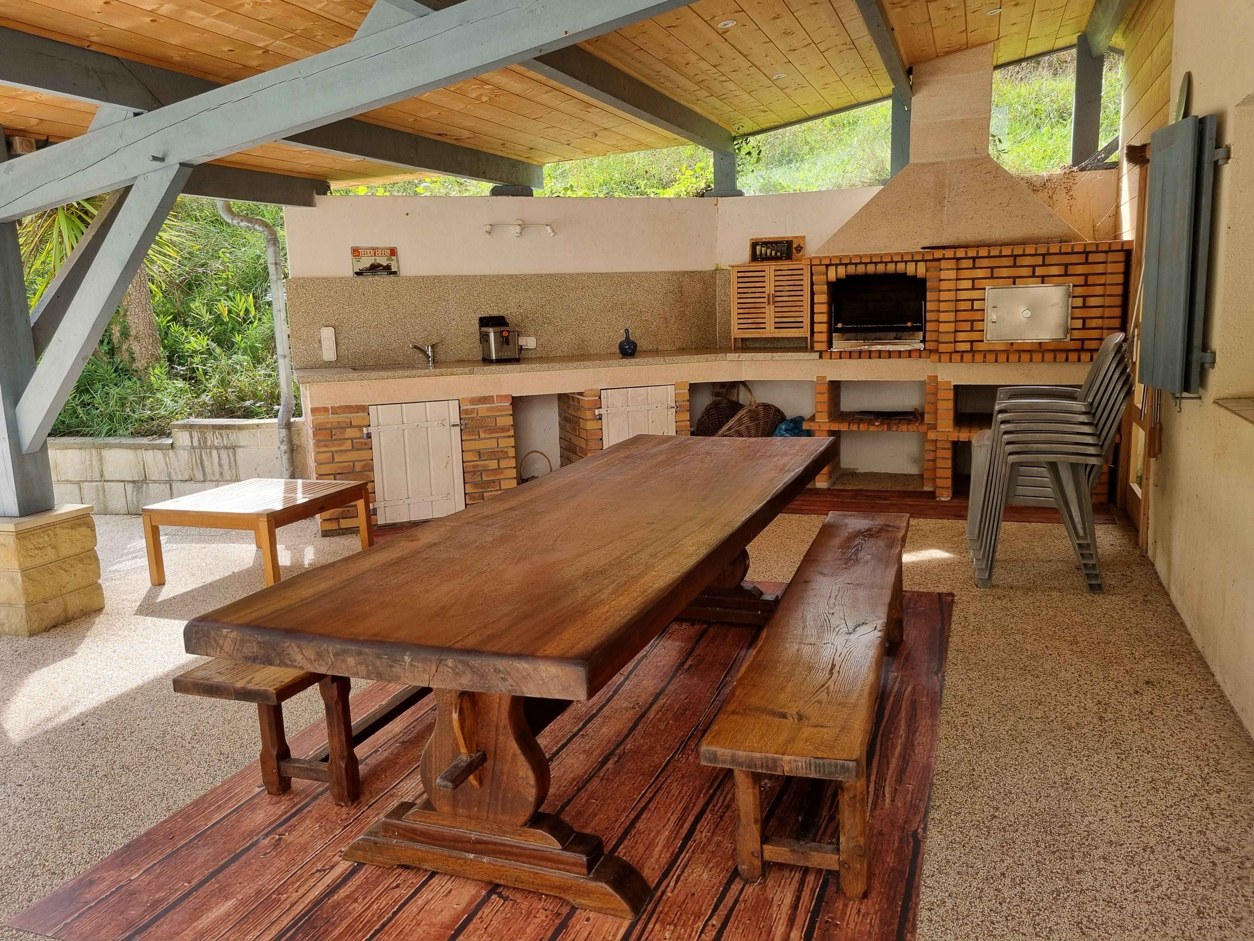 Un extérieur enchanteur avec piscine, sauna et terrain de pétanque, terrasse couverte avec coin cuisine.